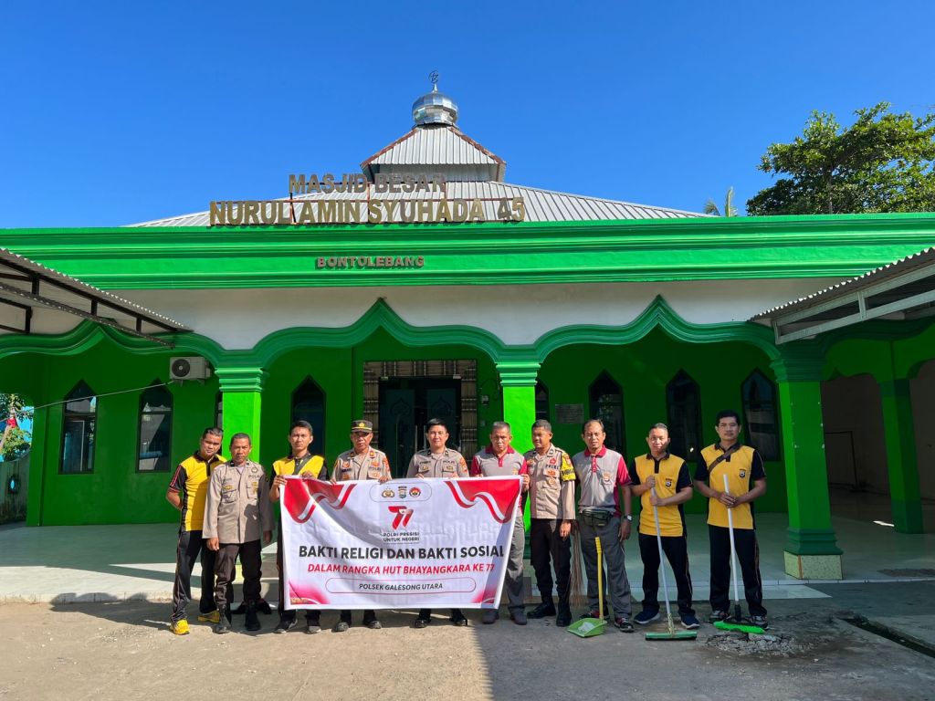 Takalar//likeberita.news-Dalam rangka menyambut Hari Bhayangkara ke-77 Tahun 2023, Polsek Galut Polres Takalar menggelar kerja Bakti Religi membersihkan tempat tempat ibadah.