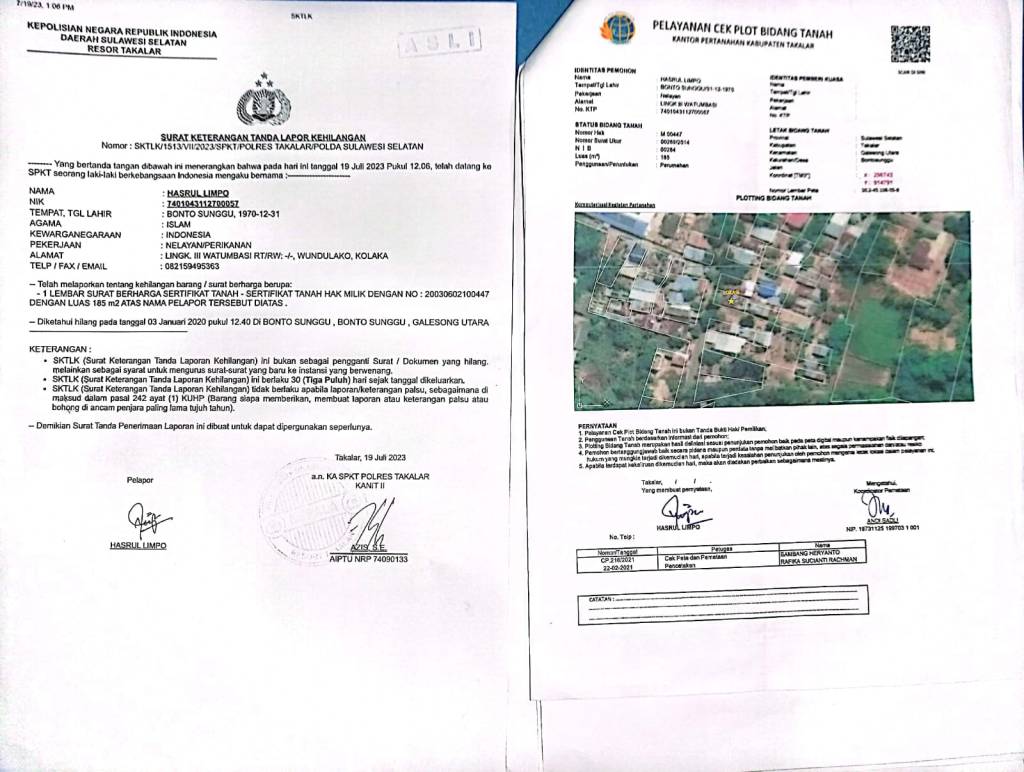 “Sehubungan dengan hilangnya sertifikat ini sehingga kami melakulan pengurusan kembali sesuai aturan prosedur pemerintahan kabupaten Takalar seperti sudah melakukan laporan kepolisian untuk minta keterangan kehilangan dipolres takalar dengan Nomor : SKTLK/1513/VII/2023/SPKT//POLRES TAKALAR/POLDA SULAWESI SELATAN dan juga sudah dilakukan melalui Pelayanan Cek Plot Bidang Tanah dikantor Pertanhan Kabupaten Takalar Status Bidang Tanah sebagai berikut , No Hak : M.00447, No Surat Ukur : 00269/2014. NIB: 00284. Dan Luas (M2) : 185 ” (*)