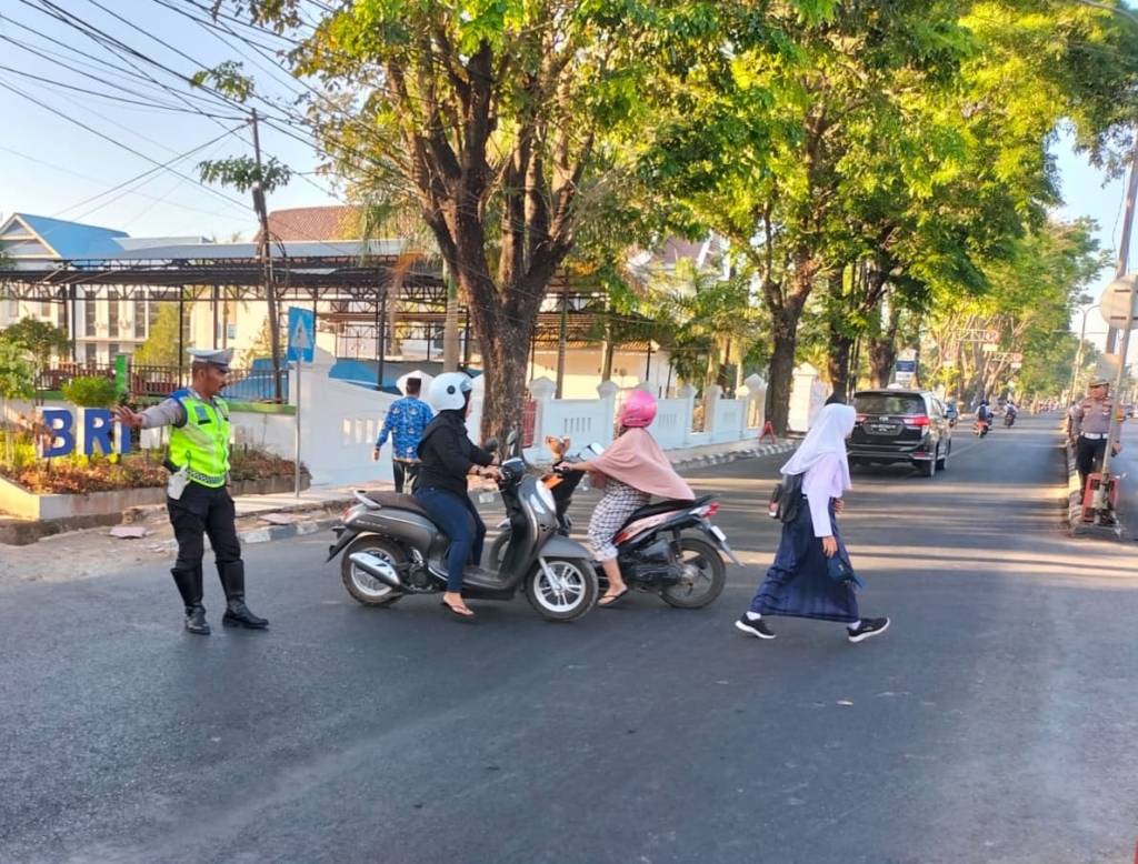 Takalar//likeberita.news-Peduli Keselamatan masyarakat, Personil Satlantas Polres Takalar jajaran Polda Sulawesi Selatan melaksanakan pengaturan arus lalu lintas pagi hari sambil membantu masyarakat menyeberang jalan, Senin (18/9/2023) pagi.