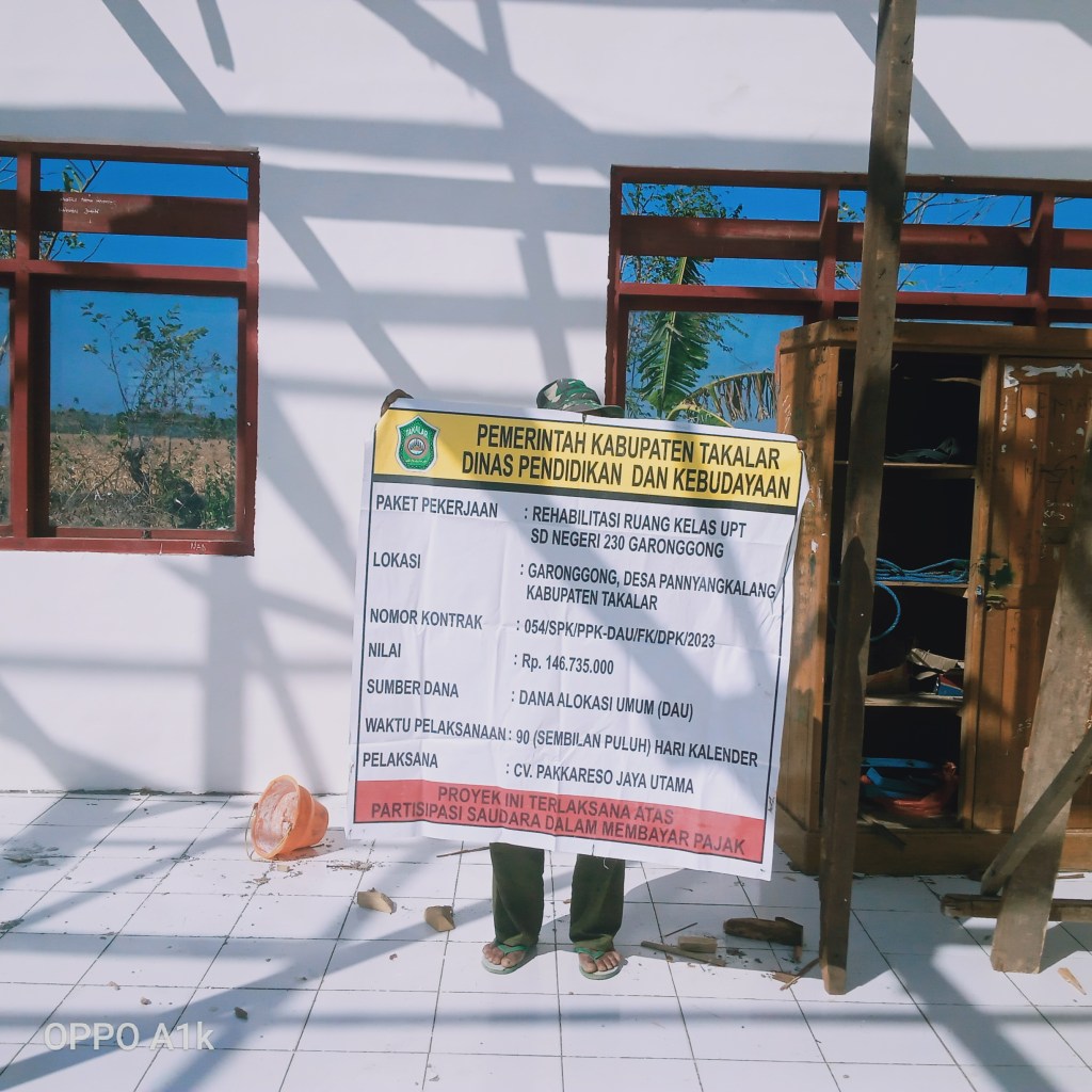 Takalar || likeberita.News – Proyek Rehabilitasi ruang kelas UPT SD Negeri Garonggong yang menggunakan sumber Dana Alokasi Umum (DAU) yang berlokasi Garonggong Desa Panyangkalang Kabupaten Takalar dinilai tidak berkualitas untuk pekerjaannya serta para pekerja (tukang) tidak menggunakan Safety untuk keselamatan kerja selaku pelaksana CV Pakkareso Jaya Utama