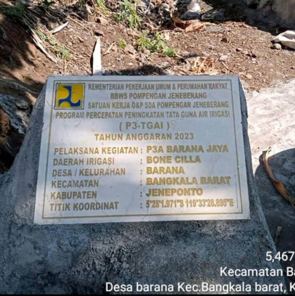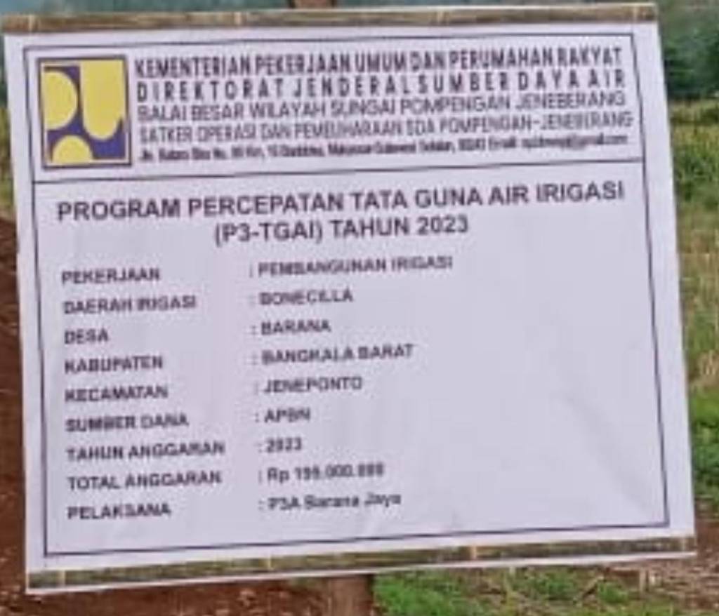 Proyek pembangunan Jaringan Irigasi untuk P3A BARANA’ JAYA, itu diakui Sekretarisnya, Sainuddin saat dikonfirmasi langsung oleh Tim Investigasi Lembaga Elang Hitam Nusantara Republik Indonesia (ELHAN RI) DPD Kabupaten Jeneponto, dilokasi pekerjaan Jembatan penghubung yang ada di Dusun Tombolo’ Desa Barana’ Senin, (2/10/2023).