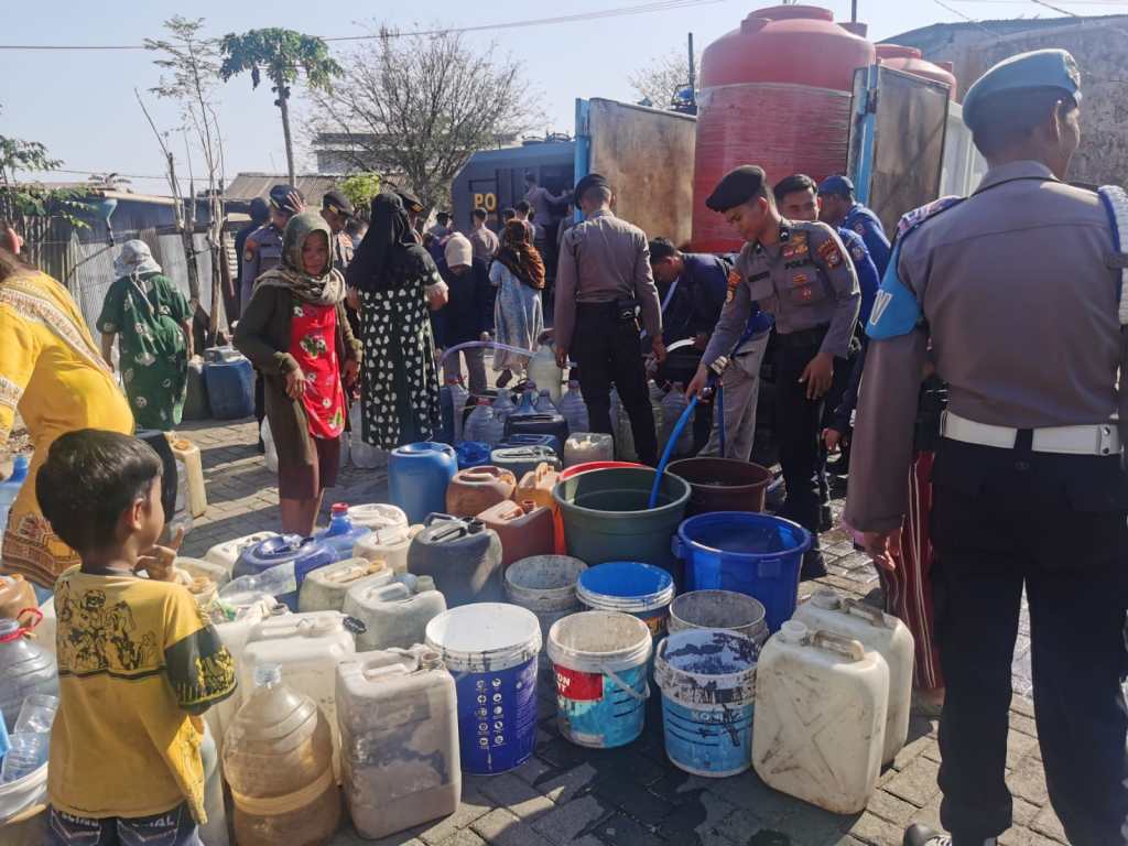 Terpantau, saat bantuan air bersih datang, warga menyambut dengan antusias untuk menampung bantuan air bersih untuk keperluan sehari-hari mereka.