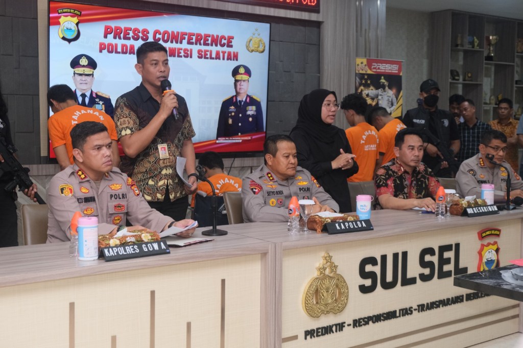 Gowa // likeberita.News – Kapolda Sulsel Irjen Pol Drs. Setyo Boedi Moempoeni Harso, S.H., M.Hum didampingi Kombes Pol. Jamaluddin Farti, S.I.K, M.Hum., Kabid Humas Polda Sulsel Kombes Pol. Komang Suartana, S.H., S.I.K., M.H., Kapolres Gowa AKBP Reonald Trauli Simanjuntak, S.I.K., S.H., M.M., M.I.K. melaksanakan Konferensi Pers Kasus tindak pidana pembunuhan berencana yang menyebabkan 3 Korban meninggal dunia di Kab .Gowa. Jumat (06/10/2023) di Mapolda Sulsel.