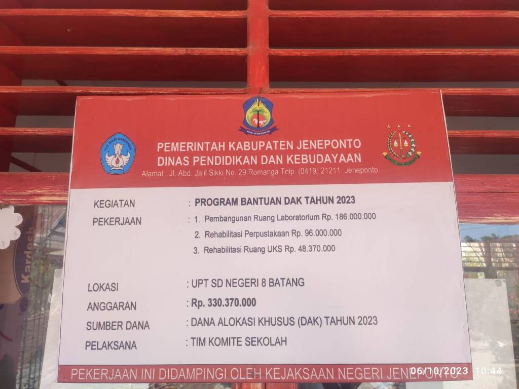Jeneponto // Likeberita.News – Program bantuan yang bersumber dari Dana Alokasi Khusus (DAK) tahun 2023, di UPT Sekolah Dasar Negeri (SDN) 8 Kecamatan Batang Kabupaten Jeneponto, mendapatkan kucuran dana RP.330.370.000, dengan 3 paket pekerjaan untuk Pembangunan Ruang Laboratorium, Rehabilitasi Perpustakaan dan Rehabilitasi Ruang UKS yang dikerjakan oleh Pelaksana Tim Komite Sekolah. Diduga tidak sesuai Spesifikasi Teknis.