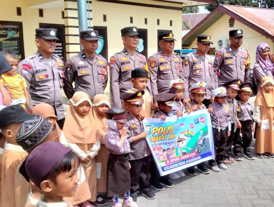 Takalar // Likeberita.News – Dalam rangka studi wisata (Filed Trip), Polsek Mapsu Polres Takalar melaksanakan kegiatan dengan Program Polisi Sahabat Anak (PSA) bersama dengan anak – anak TK Yayasan Nur Jannah Raudathul Athfal Mifhtahul Jannah Hawa, bertempat di Mapolsek Mapsu, Kecamatan Mapsu, Kabupaten Takalar. Senin (23/10/2023) pagi.