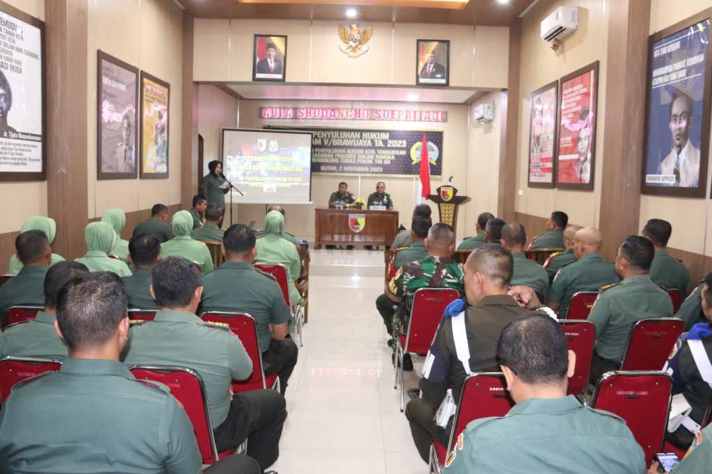 Blitar // likeberita.News – Anggota Kodim 0808/Blitar baik Perwira, Bintara, Tamtama, PNS, bersama anggota Sub Denpom V/1-3, Polkes 05.09.03, Sub Zibang, Minvet Blitar dan anggota Persit KCK Cabang XXII, menerima penyuluhan hukum dari Kumdam V/Brawijaya, yang disampaikan oleh Mayor Chk Asep Saepudin, S.H., dan Kapten Chk Eko Wahyu Siswanto, S.T., S.H.