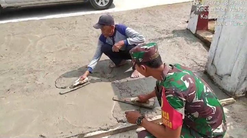 Blitar// likeberita.News – Anggota Koramil 0808/19 Wates Kodim 0808/Blitar Sertu Edi Waluyo dan Serda Heru, melaksanakan kegiatan membantu merabat marka jalan depan rumah Bapak Sukimin, bertempat di RT. 02 RW. 01 Desa Purworejo Kec. Wates Kab. Blitar, Sabtu (4/11/2023).