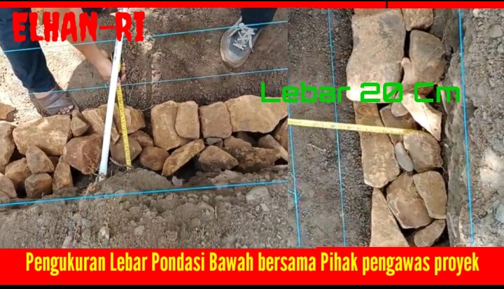 Salah satu pekerja (tukang) saat dikonfirmasi mengenai ukuran membenarkan bahwa ketinggian menyesuaikan ketinggian badan jalan dengan rata-rata pemasangan pondasi ketinggian 70cm, pondasi lebar bagian atas 30cm, pondasi lebar bagian bawah 40cm, sedangkan campuran menggunakan ukuran 3 (tiga) banding 1 (satu).
