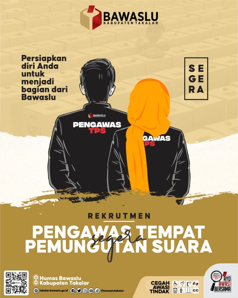 - Perpanjangan Rekrutmen Khusus TPS yang belum terisi pengawas (24 Januari-07 Februari 2024) “Sebanyak 864 Pengawas TPS se-Kabupaten Takalar akan kami rekrut, kami berharap warga Kabupaten Takalar yang memenuhi persyaratan untuk mendaftar dan dapat bergabung bersama keluarga Bawaslu Takalar untuk mengawasi TPS pada pemilu serentak tahun 2024, adapun persyaratannya telah dipublis di Media Sosial Bawaslu Takalar”, ujar Nelly, Selasa (26/12/2023