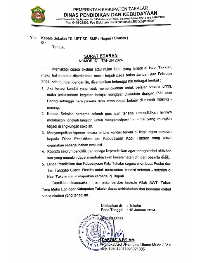 “DARWAIS Spd MM, kepala dinas pendidikan dan kebudayaan kabupaten takalar, mengatakan menuturkan bahwa cuaca ekstrim yang melanda kabupaten takalar khususnya, yang kita kedepankan adalah keselamatan diri, dan keselamatan siswa didik juga guru tenaga pendidik, sehingga pemerintah daerah melalui dinas pendidikan dan kebudayaan mengeluarka selebaran surat edaran untuk selalu waspada cuaca buruk ini, untuk itu kita buatkan posko untuk setiap saat di laporkan kepada bapak PJ bupati takalar (15/01/2024)