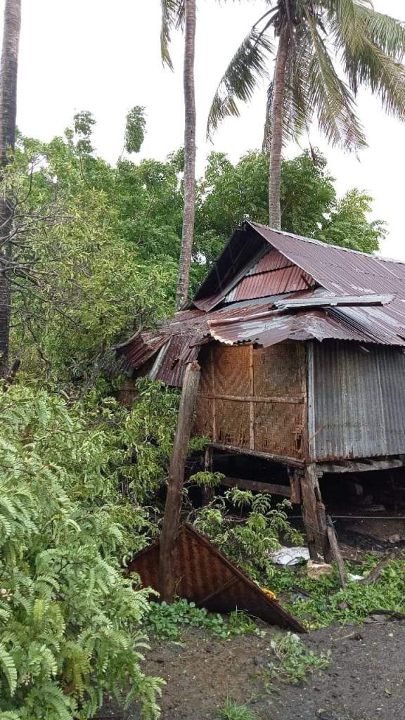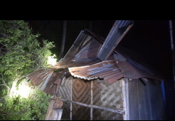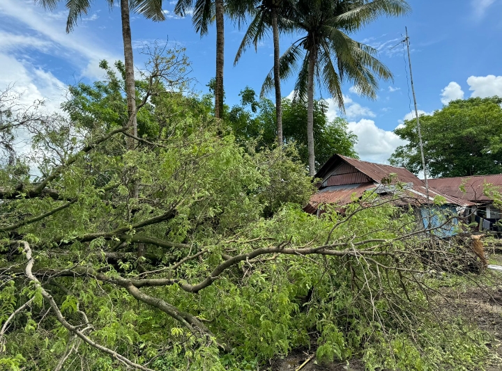 Rumah satu keluarga miskin atas nama Ince dg sila yang tertimpa ranting pohon rumah akibat angin puting beliung tersebut, banyak balok,tiang yang patah dan atapnya berhamburan pada hari Rabu ( 7/02/2024)