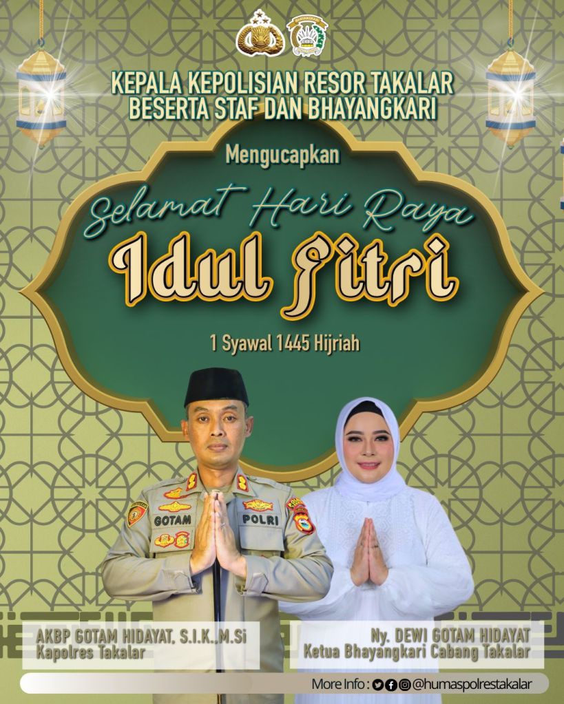 Kepala Kepolisian Resor Takalar Beserta Staf Dan Bingkari Mengucapkan Selamat Hari Raya Idul Fitri 1445 Hijriah Tahun 2024 SHARE Bagikan ke X(Membuka di jendela yang baru) X Bagikan pada Facebook(Membuka di jendela yang baru) Facebook Bagikan ke Telegram(Membuka di jendela yang baru) Telegram Bagikan ke WhatsApp(Membuka di jendela yang baru) WhatsApp Suka Memuat... Terkait Tinggalkan komentar Batalkan balasan Δ