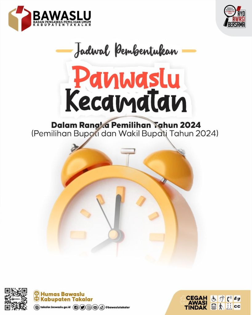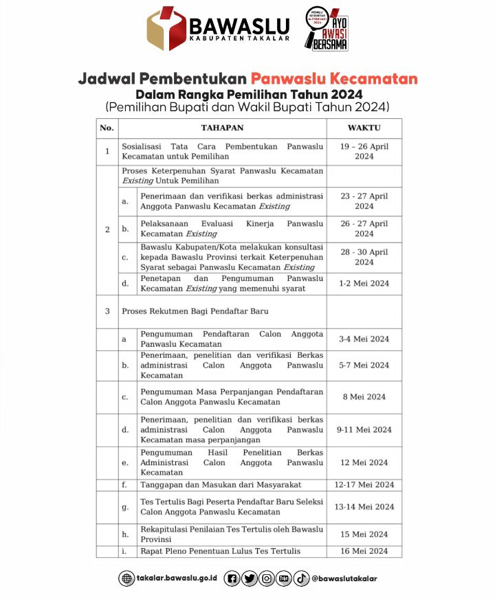“Bawaslu RI telah menerbitkan Surat Keputusan tentang Pedoman Pelaksanaan Pembentukan Panwaslu Kecamatan untuk pemilihan tahun 2024 (Pilkada Serentak), Jadwal Proses Seleksi Peserta Existing dimulai sejak tanggal 23 April 2024 hingga 02 Mei 2024, sedangkan Proses Seleksi Pendaftar Baru dimulai tanggal 03 Mei sampai dengan 25 Mei 2024“.
