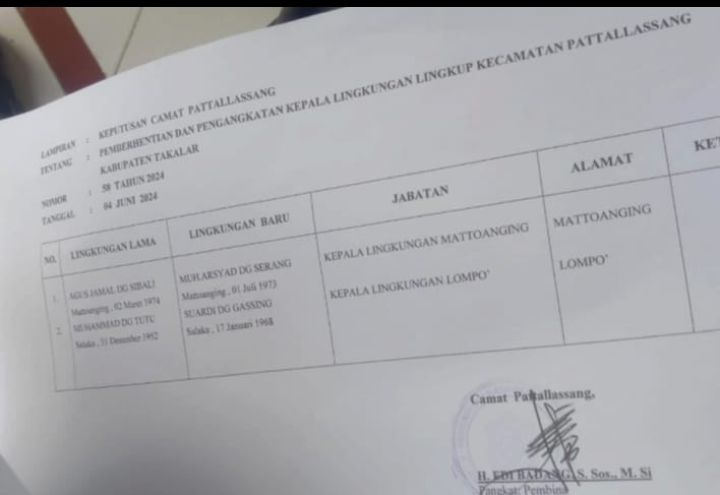 Sebelumnya diketahui dengan adanya terbit lampiran surat keputusan camat Pattallassang tentang pemberhentian dan pengangkatan kepala lingkungan kecamatan Pattallassang dengan surat Nomor : 50 Tahun 2024 yang di terbitkan per tanggal 4 juni 2024 yang tercantumkan didalam surat ada dua lingkungan yang direncanakan ada perombakan untuk kepala lingkungan yakni, kepala lingkungan Mattoanging dan kepala lingkungan Lompo’.