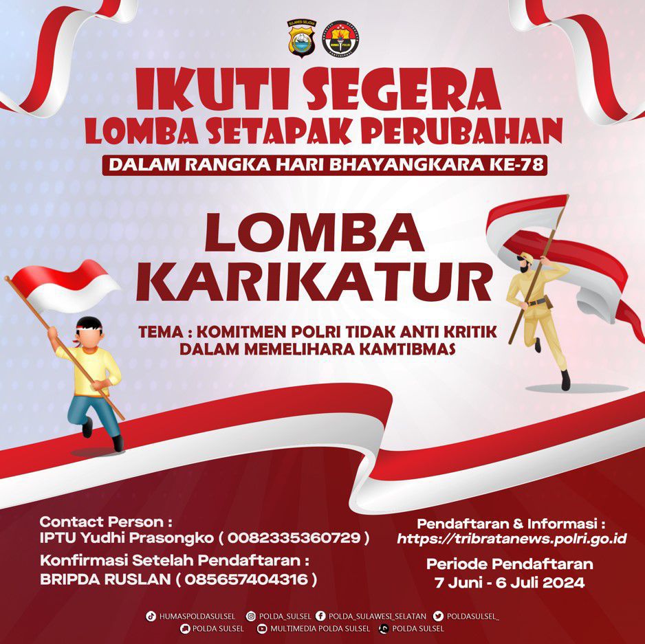 Makassar // Likeberita.News – Berbagai lomba akan dihadirkan Polri menyambut peringatan Hari Ulang Tahun (HUT) Bhayangkara ke-78. Lomba Setapak Perubahan akan dibuka untuk umum dengan hadiah menarik yang akan diperebutkan.