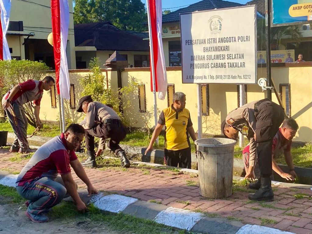 Kapolres Takalar AKBP Gotam Hidayat, S.I.K., M.Si melalui Kabag Ops Kompol Idrus saat dikonfirmasi mengatakan bahwa dalam rangka menyambut HUT Bhayangkara ke 78, kita libatkan seluruh anggota untuk kerja bakti membersihkan lingkungan Mako Polres.