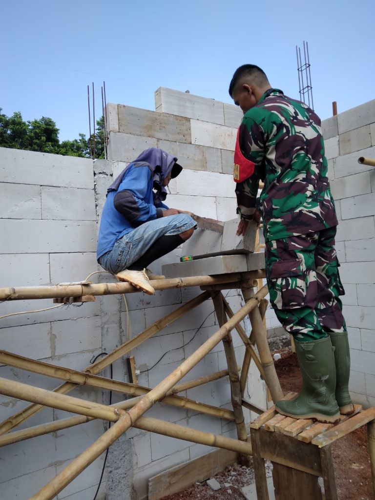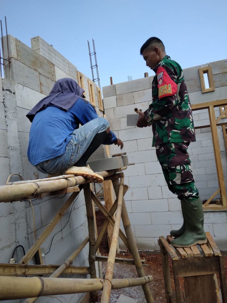 Babinsa Serda Supriyanto mengatakan pengerjaan hari ini melaksanakan pemasangan dinding rumah dengan batu hebel, membantu melubangi batu hebel untuk pengecoran dinding atas serta membantu memasang papan cor dinding atas.