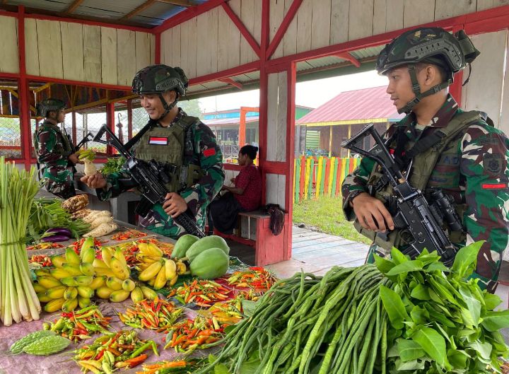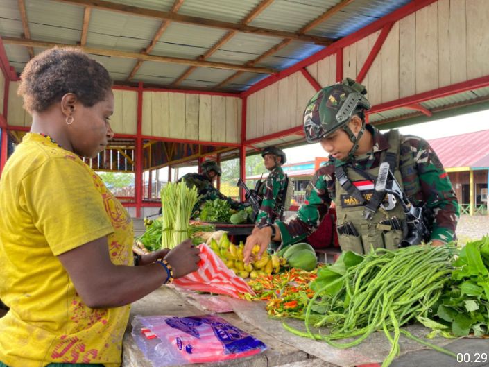 Di saat pelaksanaan pengamanan wilayah di Distrik Batas Batu, Kampung Mumugu, para Prajurit Satgas Yonif 503 Kostrad berkesempatan melintasi area Pasar Mumugu dan melakukan program ROSITA atau Borong Hasil Tani milik warga yang sedang menjual hasil taninya di area pasar, Selasa (25/6/2024).