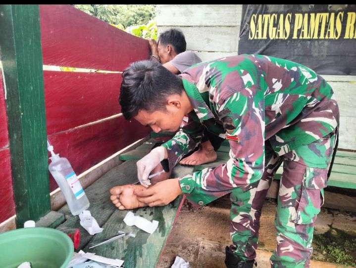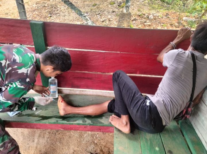 Palopo (27) seorang warga yang mengalami luka robek dikaki kanannya sehingga ia segera dilarikan ke Pos Bendungan Tami untuk meminta pertolongan dari Satgas Pamtas Yonif 122/TS dan segera ditangani oleh Personel Tenaga Kesehatan Pos Bendungan Tami Prada Gudmen Pasaribu.