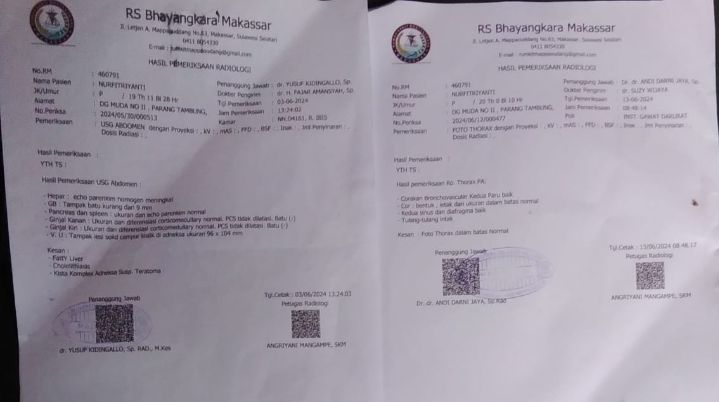Dengan gesitnya perawat tersebut melakukan tindakan kepada Nur melalui USG dimana keterangan dari hasil USG tersebut terdapat sebuah penyakit BATU EMPEDU adapun bukti dari hasilnya itu tertera pada foto dan selebaran surat yang sudah dicamtumkan tanggalnya yakni tanggal 3 Juni 2024.