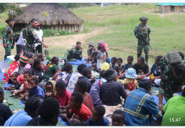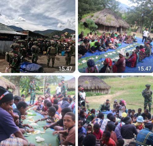 Puncak (Papua Tengah) – Prajurit Satgas Pamtas RI-PNG Mobile Yonif 323/BP Kostrad Pos Kosatgas melaksanakan kegiatan Minggu Kasih dengan melaksanakan makan bersama masyarakat Kp Kago, Distrik Ilaga, Kab.Puncak, Papua Tengah, Minggu (07/07/2024)